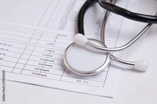 black stethoscope on a medical analysis