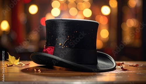 Black Top Hat with Red Ribbon Detail on Wooden Surface in Warm Bokeh Lighting