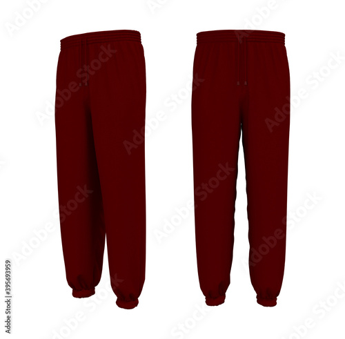 Blank pants mockup, front and side views. Sweatpants. 3d rendering, 3d illustration.