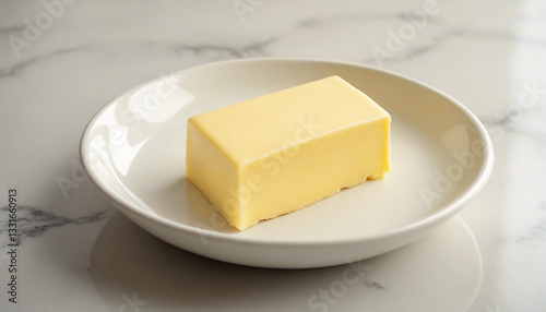 Block of creamy butter on a white plate against a marble background