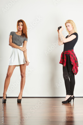 Blonde girl photographing woman