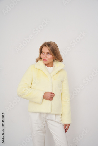 Blonde woman in yellow coat poses cheerfully against plain backdrop