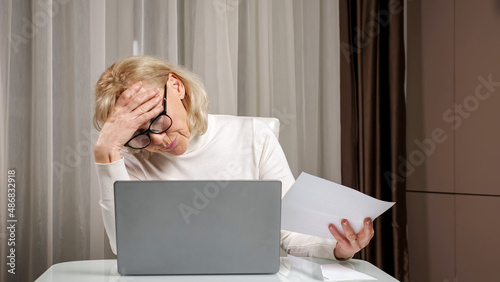 Blonde woman of middle age in turtleneck and glasses counts apartment utility bills using laptop and looking through papers sitting at table.
