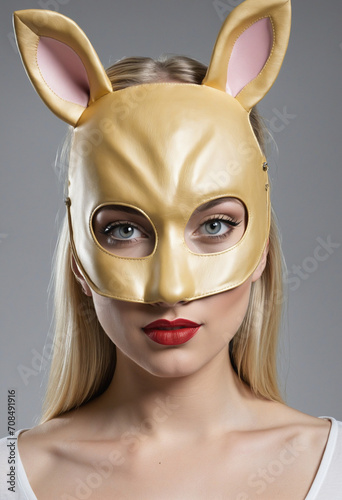 Blonde woman wearing rabbit mask making eye contact against neutral backdrop