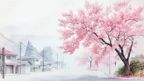 Blooming sakura trees above quiet city streets, drawn in warm pinks and soft greys. Mood: tranquil and magical