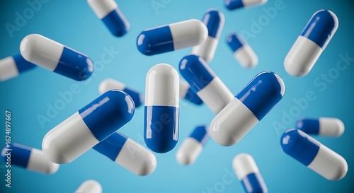 Blue and White Capsule Pills Falling on Light Blue Background Pharmaceutical Products and Medication Concepts Healthcare Industry with Medicine Capsules