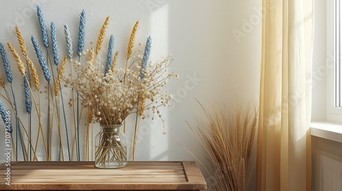 blue and yellow wheat stalks on an white textured wall, A vase of dried flowers sits on a table in a room with a window, created with generative ai