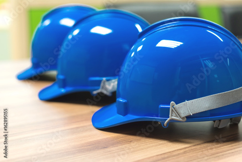 blue safety helmet, blue safety hat placed on the meeting table in the office in selective focus.