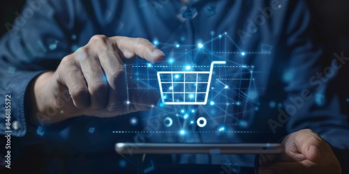 Blue transparent shopping cart icon over finger touching screen. Online shopping concept.