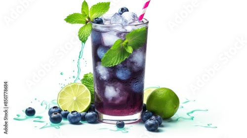 Blueberry mocktail with mint and lime in a cocktail glass against