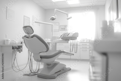 Blurred background of a modern dental clinic room interior with a chair and equipment, in a white color tone.