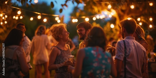 Blurred image of a backyard party at dusk with hanging lights, capturing the ambience of a summer evening