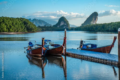 Boat and Twin mountains in the morning. Landmarks of Krabi Province, Thailand.