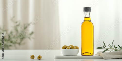 Bottle of olive oil with olives on bright background