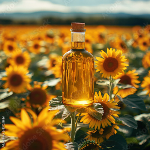 Bottle of sunflower oil standing on table surrounded by sunflowers, field sunflowers in background
