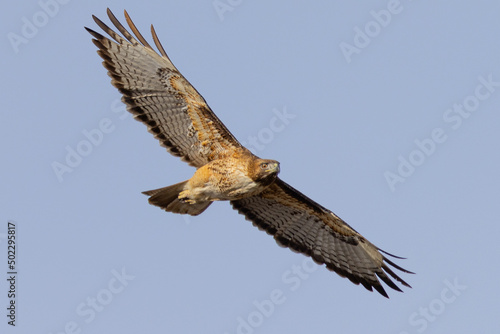 Bottom view of a red-tailed hawk flying, seen in the wild in North California