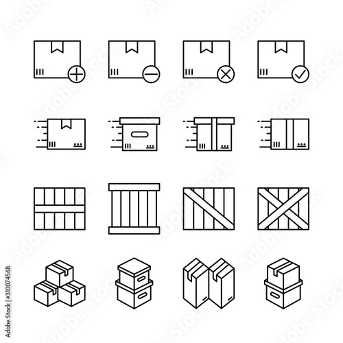 Box line icons set vector illustration. Open package, merchandise, shiping, upload, carton, wood boxes, product. Simple outline signs for delivery service. Pixel perfect. Editable Strokes.