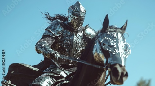 Brave Knight in Full Armor Charging on Horseback with Determined Look, Wind in Hair