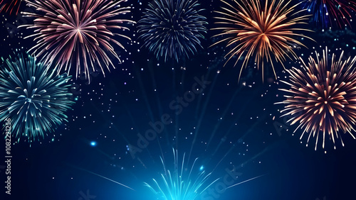 Bright and colorful fireworks against a blue festive backdrop, ideal for holiday, party, or New Year designs with copy space.