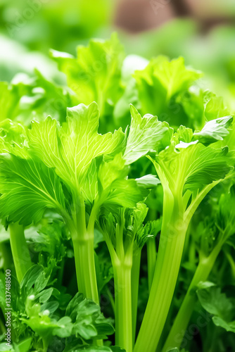Bright green celery stalks and leaves flourish in a vibrant pesticide-free garden, showcasing healthy growth under the warm embrace of sunlight