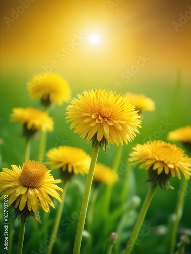 Bright yellow dandelion flowers in close-up detail against a soft green field background with delicate textures and subtle sunlight filtering through the petals