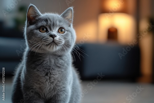 British Shorthair kitten sits gracefully in a minimalist home setting with soft lighting