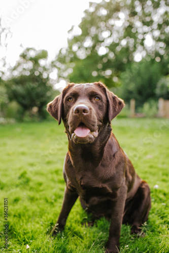 Brown chocolate labrador portrait playing outside in garden nature, looking into and away from camera, puppy dog, dog outside sticking toungue out.