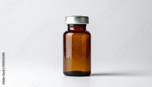 Brown glass medical bottle with metal lid, isolated on white background, empty mock-up, clean clear