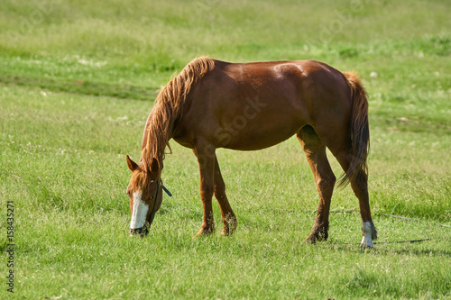 Brown horse grazing