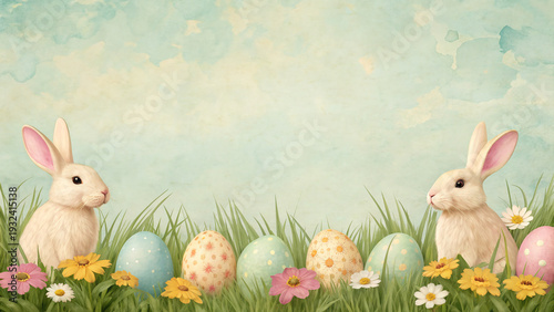 Bunnies and colorful eggs in a grassy field during Easter celebration in springtime
