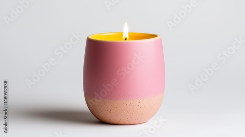 Burning Pink and Yellow Candle in Speckled Holder on White Background