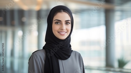 Business Career For Muslim Woman. Portrait Of Confident Arabic Businesswoman In Hijab Standing With Folded Arms Near Her Workplace In Office