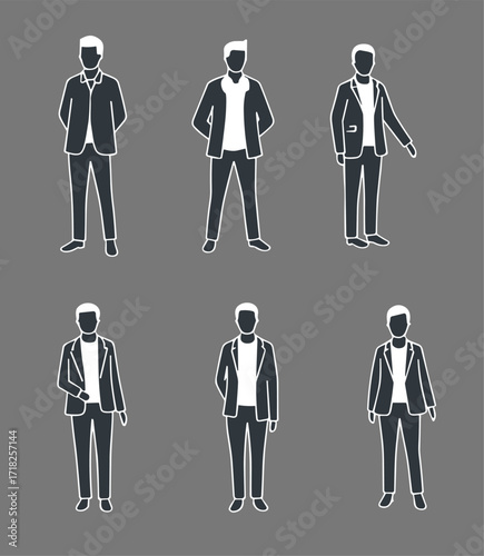 Business fashion silhouettes, male outfit icons, jacket and pants styles, white outline figures, vector design, gray background, posture set