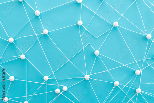 Business Network Concept on Blue Background - Flat Lay with Connected Lines and Pins