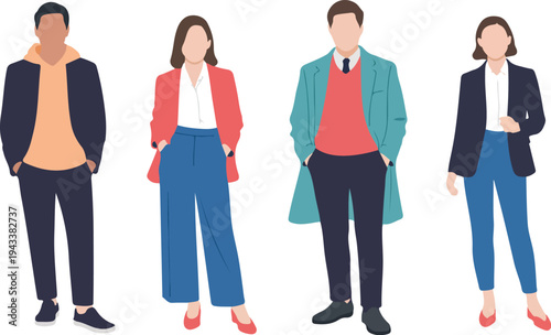 Business people standing together full body illustration, diverse professionals in office wear and casual outfits