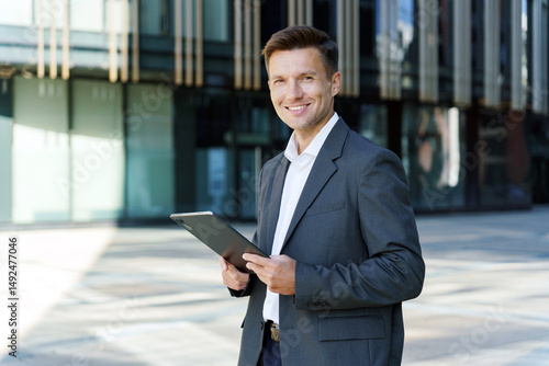 Business professional engages with digital device outside a modern office building in bright sunlight