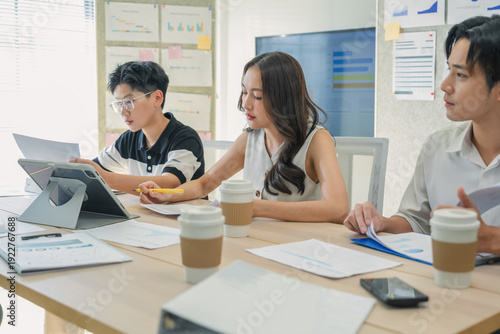 Business professionals discussing strategy in office meeting using tablet analytics and reports, teamwork collaboration analyzing market data, corporate planning session driving innovation, productivi