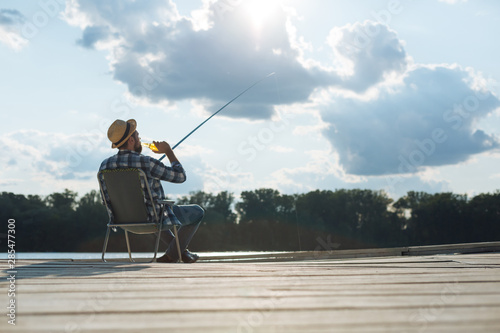 Businessman fishing and drinking beer on day off