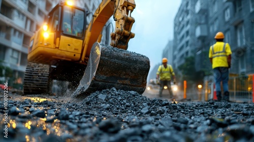 Busy Construction Scene with Yellow Excavator, Gravel Movement, and Supervising Workers in Hard Hats