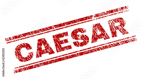 CAESAR seal print with corroded texture. Red vector rubber print of CAESAR text with unclean texture. Text label is placed between double parallel lines.