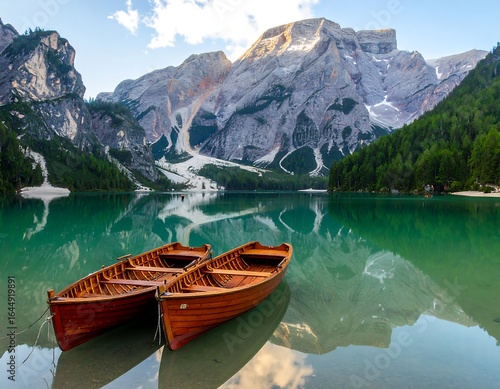 Calm lake reflecting majestic mountains and two wooden boats at sunrise