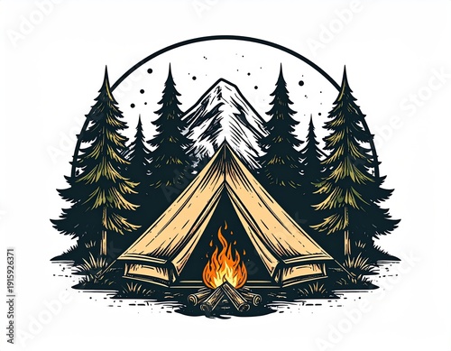 Camping scene with tent and campfire, in a forest landscape