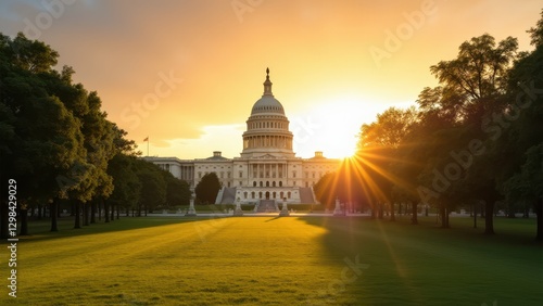 Capitol Building, Golden sunrise over the Capitol Building minimal details perfect symmetry