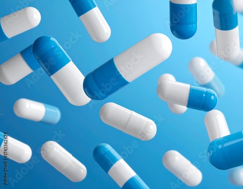 Capsules, blue and white, are scattered randomly over a gradient blue background in a studio shot