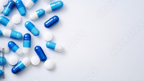 Capsules in blue and white fall on white background with space for medical product branding.