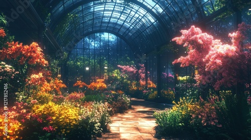 Captivating indoor botanical garden greenhouse with a stunning array of vibrant and lush floral displays set amidst the elegant and symmetrical architectural structure of glass and steel