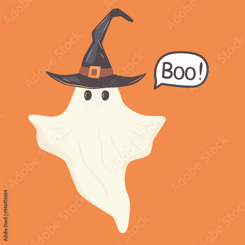 Cartoon halloween ghost wearing witch hat isolated. Halloween poster print design vector illustration