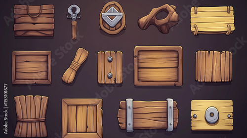 Cartoon wooden game assets,the kit for game ui development, vector gui elements