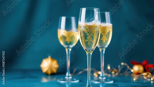 Celebrate in Style with Elegant Champagne Flutes on a Festive Blue Table Setting, Perfect for Holiday Parties and Special Occasions