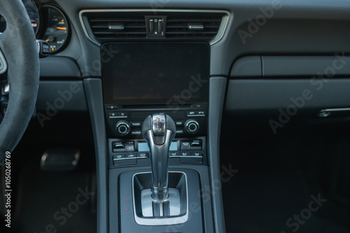 Center console of a luxury car featuring a sleek gear shifter and control buttons.